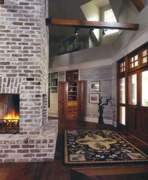 Активно используют кирпичную кладку в создании стиля кантри. В таких интерьерах непременно возводят каменные печи или камины, а кладку стен оставляют без облицовки. Ранее в этом просто не видели необходимости, так как в скромных загородных домиках не устраивались вечеринки, да собственно и не жили постоянно, а теперь необработанная кирпичная стена в жилом интерьере является признаком роскоши.