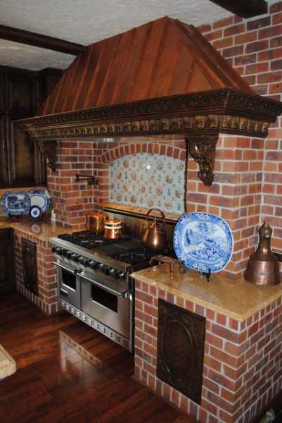 Если на кухне есть камин или печь, кирпичная кладка в отделке, это интересное и красивое решение, которое подчеркнет тепло, которое идет от очага. Кирпич добавит в домашнюю обстановку немного брутальности и привнесет изюминку в интерьер.
