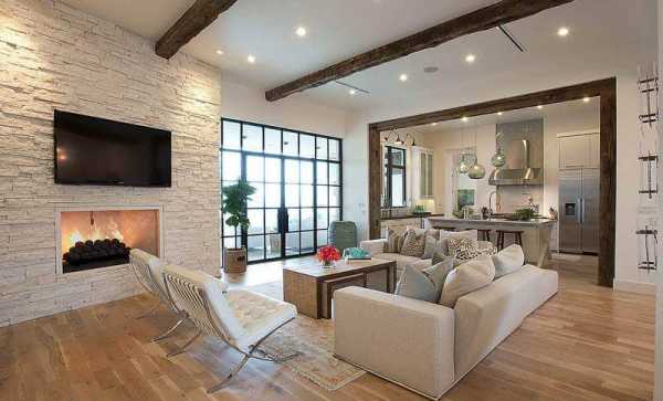 Наличие камина в гостиной с кирпичной кладкой еще больше подчеркнет домашнюю обстановку. Такое решение актуально и в городской квартире, если приобрести электрическую модель и создать для него кирпичный каркаса. Собственно такой каркас можно соорудить и без него, альтернативой источника огня может послужить пара тройка зажженных широких свечей.