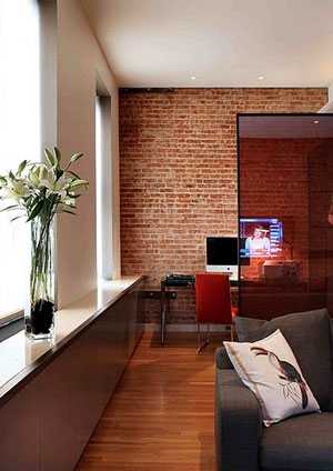 - Применив в оформлении интерьера кирпичную кладку, можно разделить комнату на зоны, например, выделить рабочее место или пространство вокруг камина. Портал камина также можно выложить из кирпича (обязательно огнеупорного, если камин действующий), или облицевать клинкерной плиткой под кирпич.