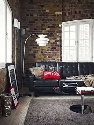 Некоторое время назад бытовало убеждение, что кирпич, как материал почти природный, можно сочетать только с натуральными цветами и материалами. Да, он отлично сочетается с натуральным нелакированным деревом, циновками, льном, шкурами, неглазированной керамикой, грубой шерстью и другими элементами рустикального, скандинавского и экологического стилей. Но, как видите, с яркими и веселыми аксессуарами он так же прекрасно комбинируется.