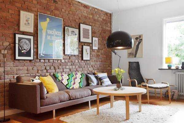Стены под кирпич в интерьереНа втором месте — это стена за диваном, такое решение не менее популярно, дополненная соответствующими картинами, настенными светильниками и пушистым ковриком на полу, она эффективно поможет создать не бывало уютную и домашнюю обстановку.