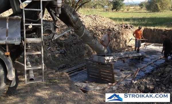 Выполняется во влажном грунте и внутри существующих сооружений. Этот способ значительно дороже за счет количества материала. Все этапы аналогичны ленточному фундаменту, только каркас делается из горизонтальных прутьев, соединенных между собой вертикальными металлическими кусками, расстояние между которыми должно равняться 20 сантиметров. Не допускается образование мелких пор и пустот, в противном случае фундамент может потрескаться.