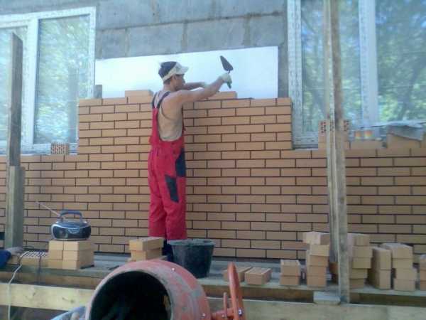 Сначала необходимо сформировать углы на высоту 5-6 рядов. Затем между блоками следует натянуть нить, чтобы выкладка была ровной. И вот теперь нужно сделать расшивку швов. То есть, используя специальное приспособление, выполнить такие действия, чтобы шов выступал на несколько миллиметров от внешней стороны облицовочной кладки. Далее совершается выкладка рядов. Для аккуратности используется шаблон. Важно не забывать каждые 4 ряда протирать облицовку влажной тряпкой, чтобы убрать загрязнения. Лучше всего, если появилось загрязнение, его тут же убрать.