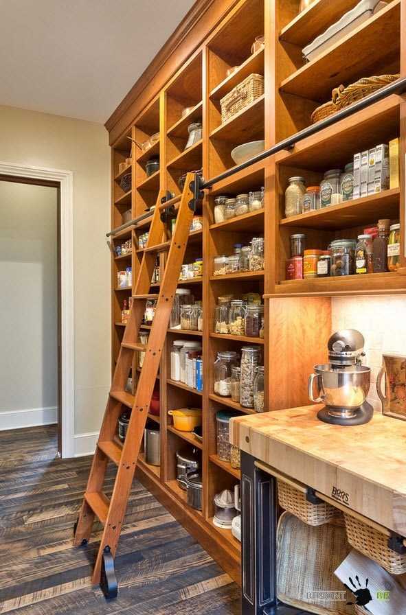 Как же обустроить кладовую? Можно сделать открытые полки от потолка до пола. Не забудьте добавить несколько выдвижных ящиков или распашные шкафчики в нижней части. Если потолки в вашей кладовки очень высокие, подумаете как обеспечить доступ к предметам, которые будут находится на самых верхних полках. Например, можно поставить приставную лестницу, которую можно закрепить в верхней части к поручню. С ее помощью можно будет доставать абсолютно все предметы, которые находятся очень высоко.