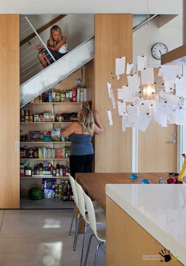 Если ваша кухня расположена вблизи лестницы, ведущей на второй этаж, то не воспользоваться свободным пространством под этой самой лестницей, будет непростительной оплошностью. Удивительно, насколько вместительным может оказаться ниша, которую раньше просто не использовали. Обычные открытые полки, которые вы сможете установить самостоятельно, организуют для вас вместительную кладовку под лестницей.