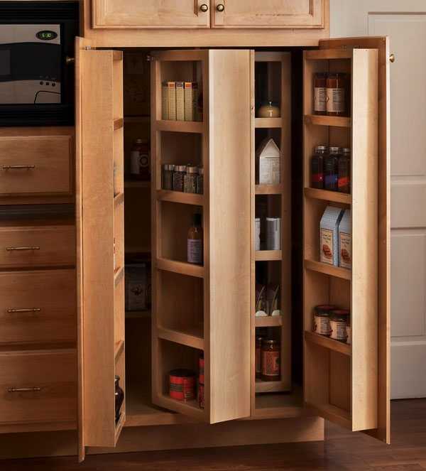 В зарубежных дизайн-проектах кухонь различных размеров часто можно встретить большой кухонный шкаф, внутри которого размещен целый мир хранения специй, масел и прочих приправ. Подобные системы хранения становятся популярны и среди наших соотечественников. Это очень удобный способ упорядочить доступ к предметам, которые часто нужны в процессе готовки и возможность обойтись без дополнительного помещения под отдельную кладовую.