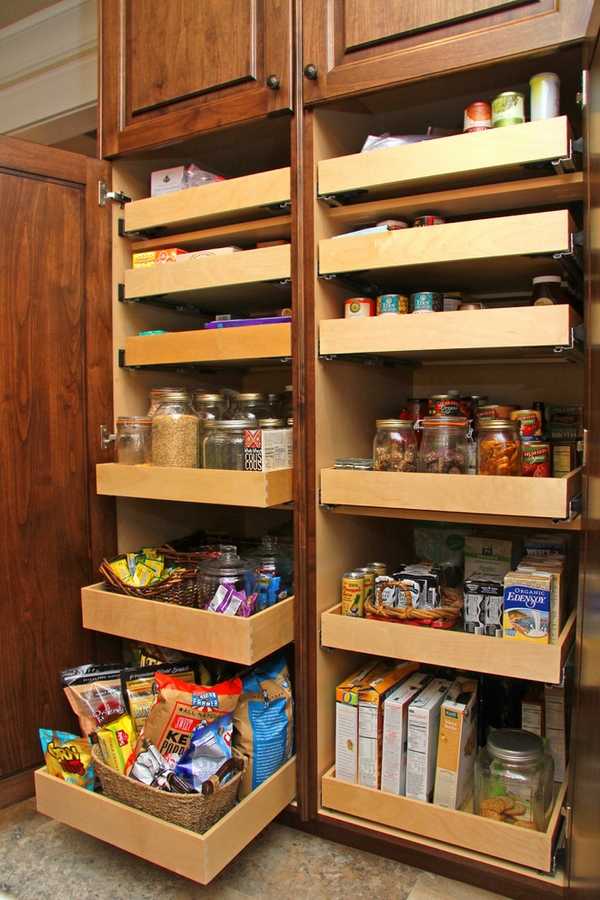 В неглубоких стеллажах, которые могут выдвигаться и складываться как книжка. Удобно хранить не только банки со специями и контейнеры с крупами, но и пачки с сухими завтраками.