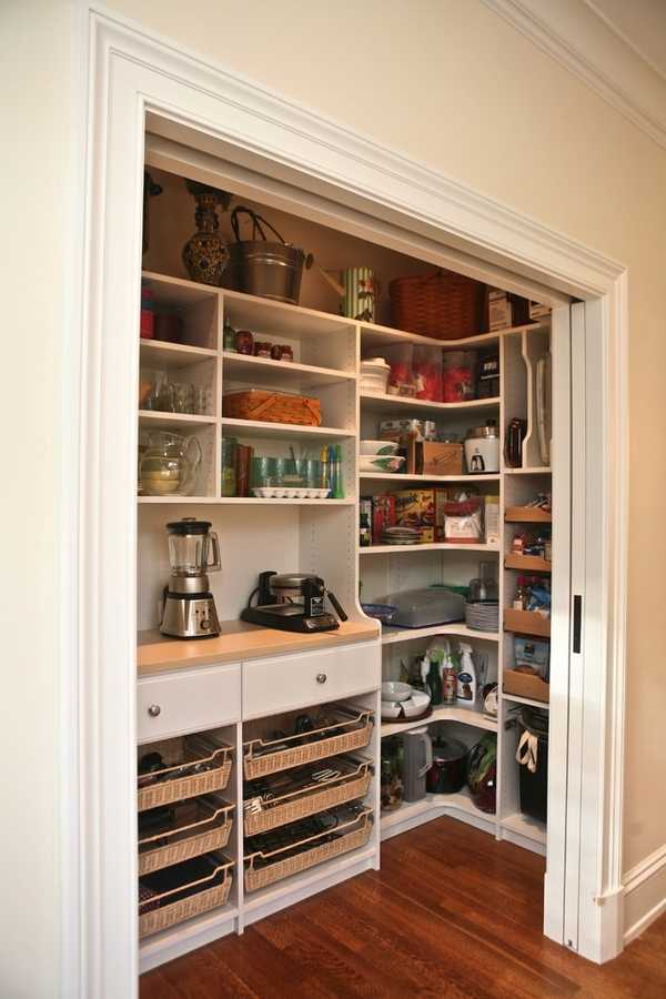 А что, если у вас нет кладовой комнаты вообще? Тогда вы можете организовать под кладовку встроенный шкаф в коридоре или угловую кладовку на кухне! Фото таких интересных решений завершают нашу статью.