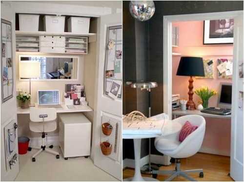 - кладовка-офис – вариант, конечно, не для всех, но также имеет место быть. Площадь помещения должна быть достаточной для размещения небольшого стола и стула, пространство под потолком используют для хранения. Уместной тут будет магнитная доска. В рабочем помещении без окон организация освещения требует особого внимания.