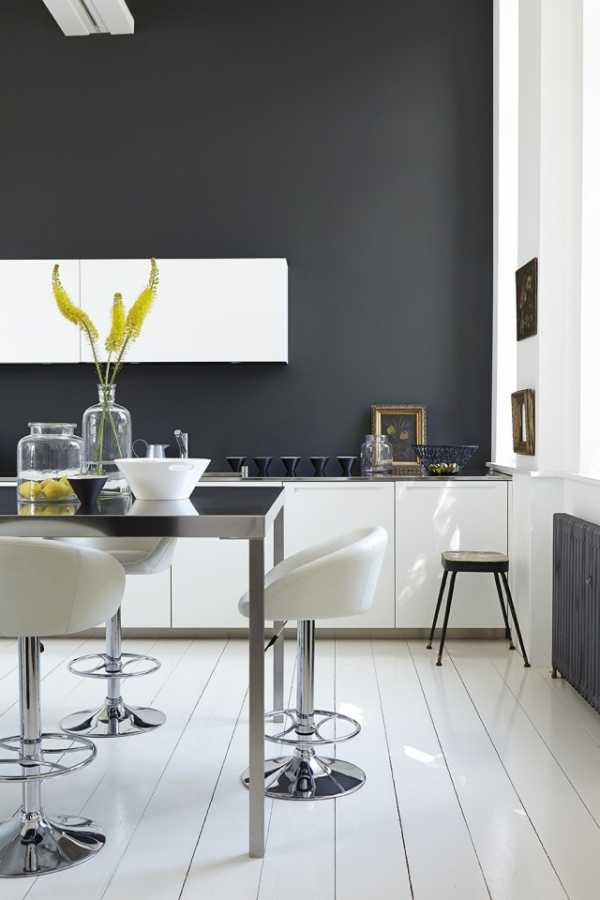 Белые фасады кухни могут выглядеть несколько «стерильно», создавать ощущение операционной, особенно в комбинации со стальной бытовой техникой. Такого эффекта можно избежать, выкрасив стены в мягкий желтый или теплый бежевый цвета. Активный терракотовый подчеркнет оконную раму или пол. Кроме того, цветные ручки на фасадах и кухонные принадлежности разнообразят цветовую гамму. Вот еще несколько неожиданных цветовых решений для белой кухни: голубые стены в сочетании с красными акцентами или фиолетовые стены с солнечными желтыми или мятными аксессуарами.