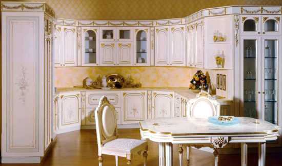 Этот же принцип соблюдается и в выборе материалов для отделки пола, стен и потолка. Статусная мебель требует натуральных материалов и в напольном покрытии. Кухня классика из массива дуба, бука, ольхи, и других ценных пород древесины хорошо сочетается с деревянным лакированным паркетом.