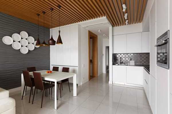 Первый недостаток − пресловутая маркость белого цвета, которая устраняется выбором качественных материалов. По той же причине следует отказаться от деревянного напольного покрытия: здесь лучше выполнить пол из кафеля, камня или линолеума.