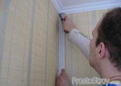 В местах соединения стены и потолка или около плинтусов обои подрезаются с помощью специальной линейки для обрезки краев. По своей сути такая линейка является треугольником, который одновременно подгоняет края полотна и обрезает лишние части. Использование такой линейки защитит поверхности плинтусов и потолка от повреждений или попаданий клея, а обрезанные края будут ровными и аккуратными.