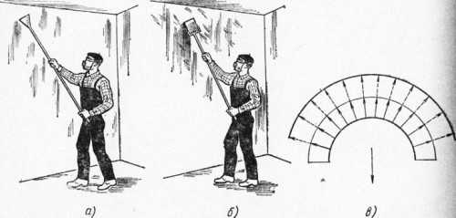 Схема очистки стены от старой отделки: а) очистка, б) сглаживание, в) перемещение инструмента.