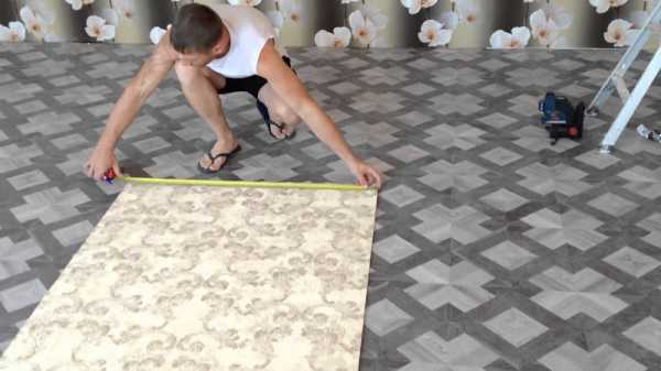 1.Начисто вымытый или застеленный полиэтиленовой пленкой пол рулон укладывается лицевой поверхностью вниз. Рулеткой отмеряется нужная длина (высота помещения + минимум 10-15 мм запаса). Рулон сгибается по длине и отрезается по сгибу.