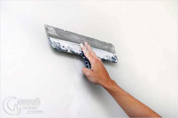 - После этого приложите широкий шпатель встык между стеной и потолком для того, чтобы обрезать излишки.