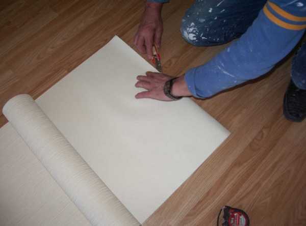 Рулон раскатывают лицевой частью вниз и, отмерив необходимое расстояние, делают засечку ножом. Обои сгибают по нанесенной отметке так, чтобы кромки основного листа и отогнутой части совпали между собой. Полотно придавливают и разрезают вдоль сгиба.