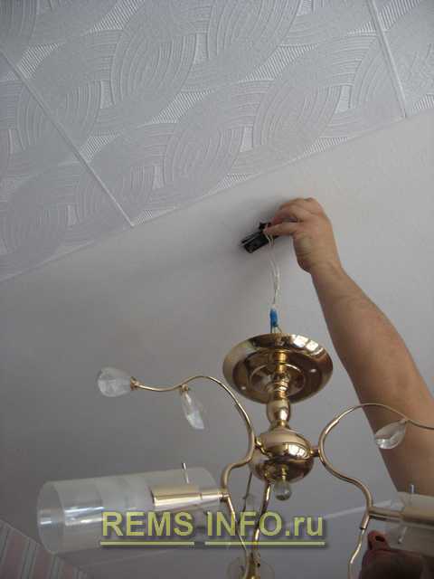 Если клеим потолочную плитку на побелку, начиная от места, где висит люстра, а не от центра комнаты, то углы у примыкающих плиток срезают, чтобы уложить их возле крепежа (прочитайте: «Как приклеить потолочную плитку: особенности установки»). Не стоит беспокоиться об этом пустом месте – впоследствии оно прикроется колпаком люстры.