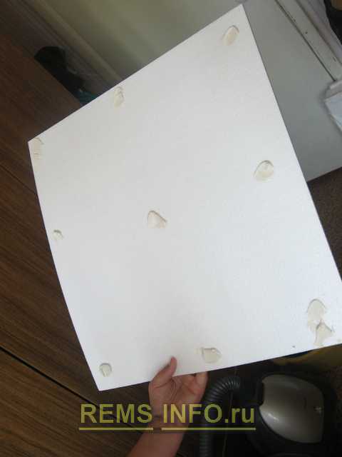 Клей наносится на специальные выступы на изнаночной стороне плитки. Или же он наносится посередине плитки и у каждого угла, а также на потолок.