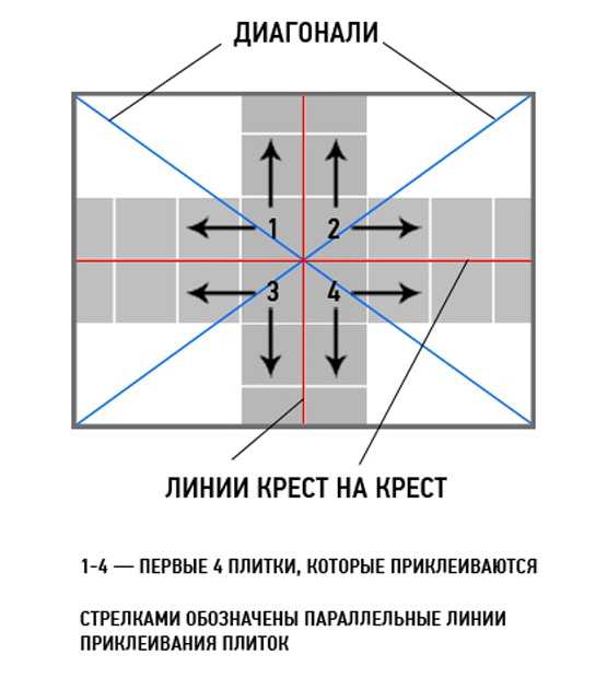 Первую плитку нужно приклеить так, чтобы один из углов был точно в центральной точке. Ориентируйтесь краями плитки по ниткам или намеченным вами линиям. В итоге, в центральной точке будут сходиться все 4 плитки.