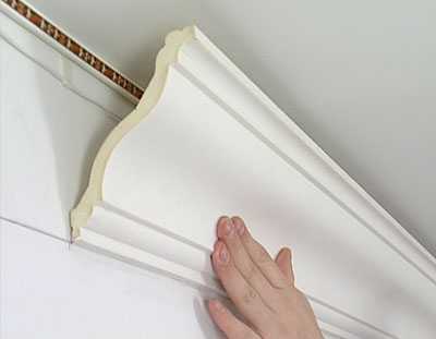 Завершающим этапом при поклейке потолочной плитки является оформление краев. Для этого используется пенопластовый плинтус. Для наклейки подойдет тот же клей, что и для плит. Чтобы не возникало проблем с углами, проще приобрести специальные угловые элементы, соответствующие размеру и рисунку плинтуса.