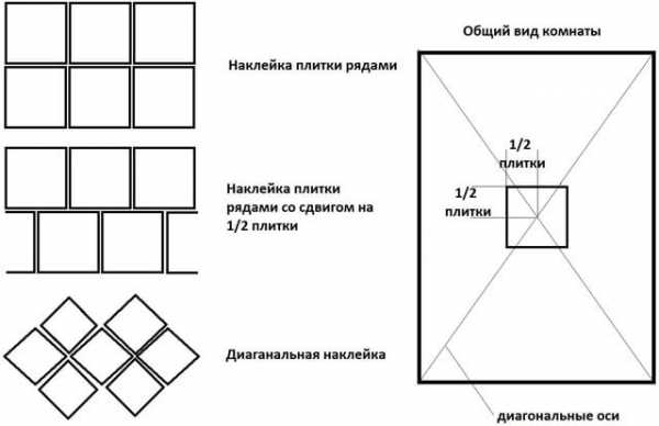 3. Далее приклеиваем плитки от центра до стены вдоль всех осей.