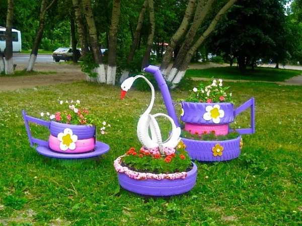 Одним из самых элегантных творений из старых протекторов считается клумба-лебедь.
