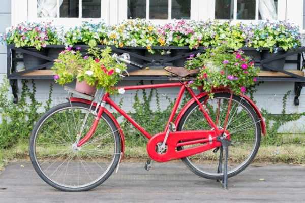 - Велосипед. Его можно вкопать в землю до средины колес, а в корзины спереди и на багажнике набрать землю, в которой и будут высажены растения.