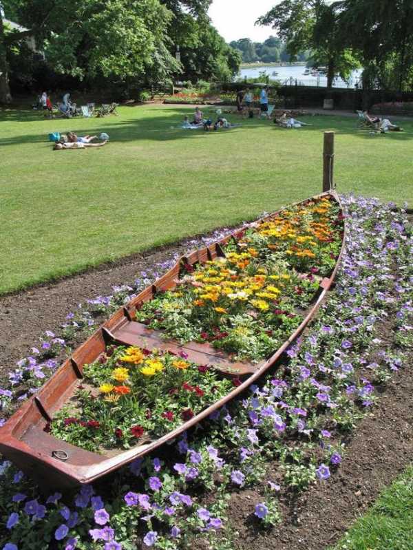 - Старая лодка. Она заполняется землей или в нее выкладываются цветы в горшках.