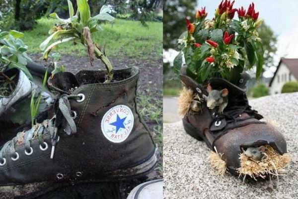 Обустраивая клумбы из подручных средств, можно использовать даже старую посуду и сношенную обувь.