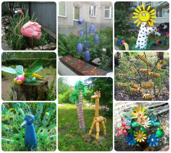 Декоративные фигурки и небольшая клумба из пластиковых бутылок своими руками фото представлено ниже.