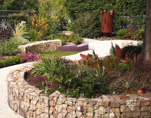 Эти материалы позволяют создавать цветники любой формы, нужно лишь сделать опалубку из сетки и засыпать её галькой, бутом или щебнем. Затем наполнить клумбу землёй и высадить растения.