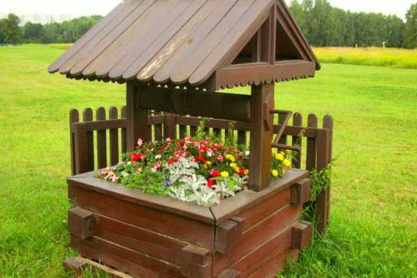 Из ненужных досок и брёвен можно сколотить прекрасную имитацию колодца, или цветник со скамейкой. Из большого бревна можно вырубить середину, проделать отверстия для стока воды, насыпать 2 – 3 см керамзита или щебня в качестве дренажа, наполнить его грунтом и посеять цветы или просто зелень. Примеры смотрите на фото.