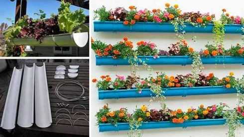Подвесные кашпо из труб, распиленных вдоль – симпатичное украшение для забора.