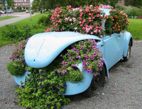 Оформление клумб – реальная возможность сотворить что-нибудь красивое и оригинальное. Перед воплощением идеи с транспортом позаботьтесь, чтобы из него были изъяты вещества, способные нанести вред растениям (аккумулятор и т. д.).