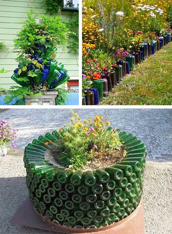 Стеклянные бутылки можно просто закопать в землю вверх дном в виде бордюра, а можно выложить из них целую стенку при помощи цементного раствора. Из пластиковых бутылок получаются отличные кашпо. Самые симпатичные варианты на фото: