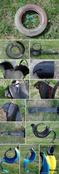 - Покрышка разрезается, на ней делаются надрезы и у вас в руках лебедь или интерпретация другого животного. Металлический каркас позволяет придавать покрышке любую форму.