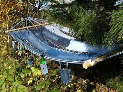 Хорошим вариантом будет обновление уже имеющегося гамака. Но помните, что потребуются очень крепкие вещи, делать из которых тряпки очень жалко. Крепежный материал, веревки и другие предметы применяем от старого гамака, как раз они изнашиваются меньше, чем само полотно. Сшиваем несколько пар при помощи толстой и достаточно прочной нитки. Направляющие и веревки требуется прикрепить точно так, как было у старого изделия. Остатки штанов можно применить, создав из них что-то в виде кармана или сумки. Закрепив их по бокам, они приютят бутылку с водичкой, книгу, очки, крем от солнца и ряд других мелочей, которые будут полезны для отдыхающих в гамаке.