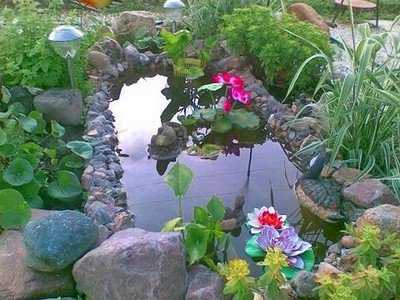 Многие покрывают внутреннею часть ванны темной краской для большего сходства с настоящим прудом. Края пруда можно украсить разными камнями, фонарями, фигурами и цветами. Хорошо подойдут папоротники, колокольчики, ирис и другие.