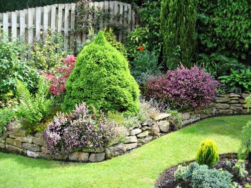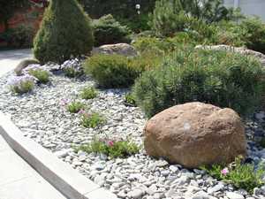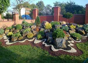 Небольшие хвойные растения станут достойным украшением цветника. Речь идёт о туях, карликовой сосне, барбарисе, иве. Композиция со стелющимися растениями (молочай, тимьян, колокольчик), компактными кустарниками или многолетними гвоздиками и иберисами прекрасно разнообразит пейзаж дачного участка. Небольшие растения высаживают в расщелинах камней. Помните только, что такие цветы не должны бояться засухи.