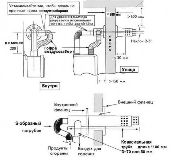 Если вы приобрели «штатный» коаксиальный дымоход – требования к установке подобной системы, а равно и схему монтажа такой конструкции, можно обнаружить в документации к нагревательному прибору. В «паспорте» котла или водогрейной колонки будет изложен порядок монтажа и указаны установочные размеры – расстояние до котла, диаметр прохода сквозь стену и прочее.