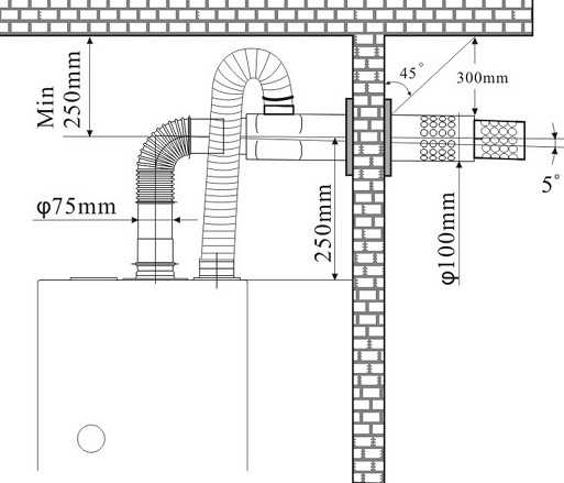 - Отверстие для вывода трубы на улицу располагают на высоте не менее 150 см от отопительного котла и 200-250 см от уровня земли.