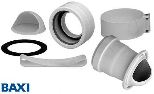 Коаксиальные дымоходы для котлов продаются отдельно. В комплект входит: боковой наконечник, колено 90 град., адаптер, фланец, соединительные хомуты и декоративные накладки. Некоторые модели поставляются вместе с дымоходом.