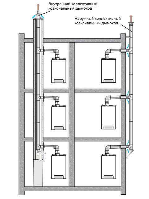 Для обслуживания одного отопительного прибора используются индивидуальные коаксиальные дымоходы. Это простые системы без разветвлений, которые могут иметь различную конфигурацию. Для работы с несколькими котлами монтируют коллективный дымоотвод. Это шахтная система с несколькими разветвлениями. При этом каждая из веток отходит к одному из теплогенераторов. Такая конструкция может быть только вертикальной.