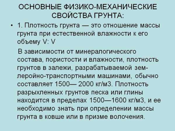 - Плотность – масса 1 м3 грунта в плотном (естественном) состоянии. Самые плотные и тяжелые скальные породы, наиболее легкие – песчаные, супесчаные почвы.