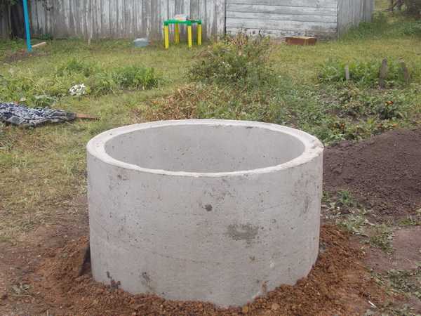 - Выкопайте яму такого размера, чтобы в нее можно было погрузить первое кольцо (оно должно выступать над уровнем земли на 10-15 см).