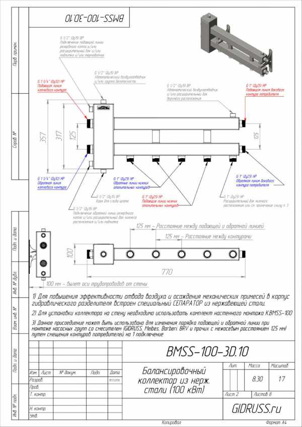 BMSS-100-3D — это балансировочный коллектор (гидрострелка+коллектор) на 3 контура: 2 направлено вниз, 1 вверх (м.о.р 125 мм), 1 в сторону (м.о.р 160 мм). Последний можно использовать для подключения резервного котла или дополнительного контура.