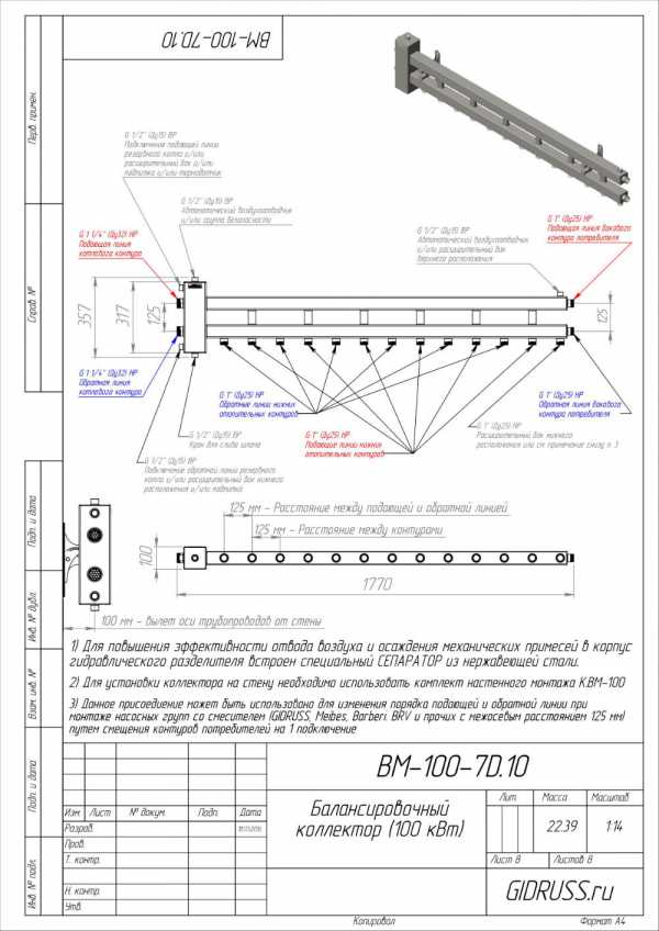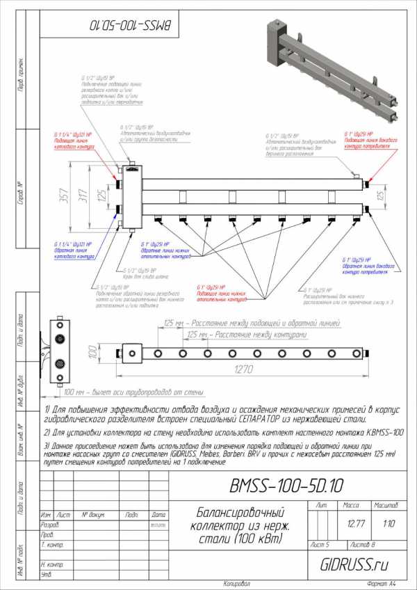 BM-100-5D 09Г2С | Коллектор отопления с гидрострелкой Gidruss BM-100-5D (100 кВт, 5 контуров вверх G 1» НР, вход G 1 1/4» НР Межосевое расстояние 125 мм) | 17900 р. | ||||
