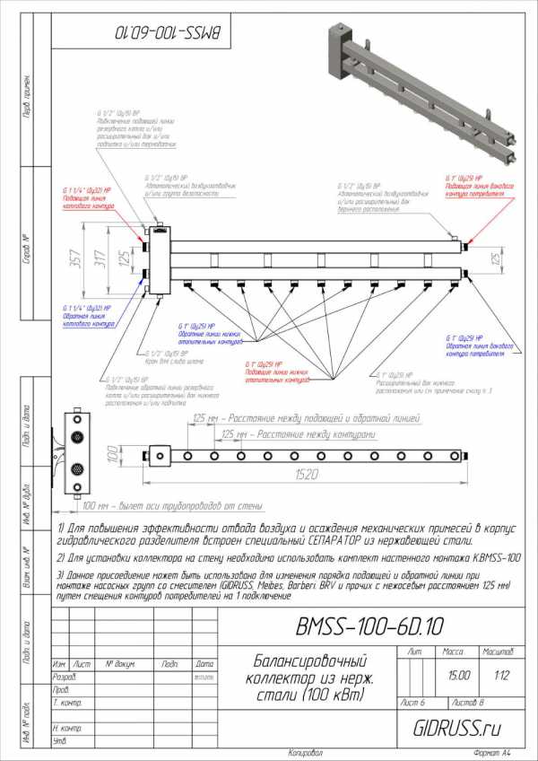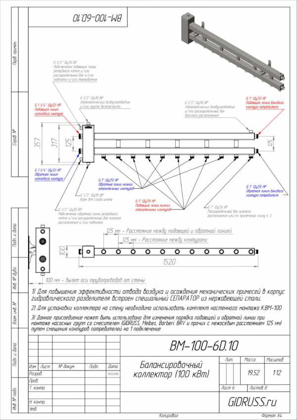 BM-100-6D 09Г2С | Коллектор отопления с гидрострелкой Gidruss BM-100-6D (100 кВт, 6 контуров, вход G 1 1/4″, выход 1″ Межосевое расстояние 125 мм) | 19700 р. |